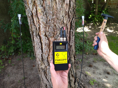 - Transducers are identical. Please select the transducer, connected to the „Start” connector. A colour mark helps you to identify the start transducer. Hit the start sensor by using hammer. The hit should always be parallel with the direction of the nail. Use a rubber hammer for driving in the sensors. For the measurement use a 100 g steel hammer. Let the hammer spring back. After use, switch off the unit.